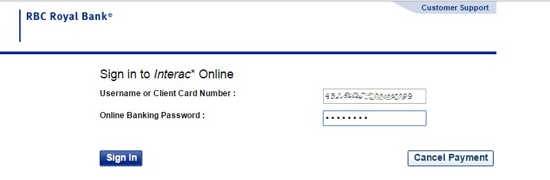 - 如果您使用RBC、Scotia、BMO,请选择Interac Online方式并点击下方绿色按钮继续。